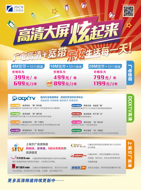 無以倫比的動(dòng)感畫面、多聲道環(huán)繞立體聲的逼真效果,大畫面、大場(chǎng)景、大制作的中外影片帶您步入高清新“視界”。高清頻道 目前可免費(fèi)收看的高清頻道有CCTV-1高清、CCTV-5+高清、北京衛(wèi)視高清、東方衛(wèi)視高清、江蘇衛(wèi)視高清、湖南衛(wèi)視高清、黑龍江衛(wèi)視高清、深圳衛(wèi)視高清、廣東衛(wèi)視高清和浙江衛(wèi)視高清等10家公共頻道,此外近期又新增CCTV-3高清、CCTV-5高清、CCTV-6高清、CCTV-8高清等4套高清節(jié)目。另外客戶也可根據(jù)意愿開通付費(fèi)節(jié)目DOX四套高清頻道和新視覺五高清頻道。