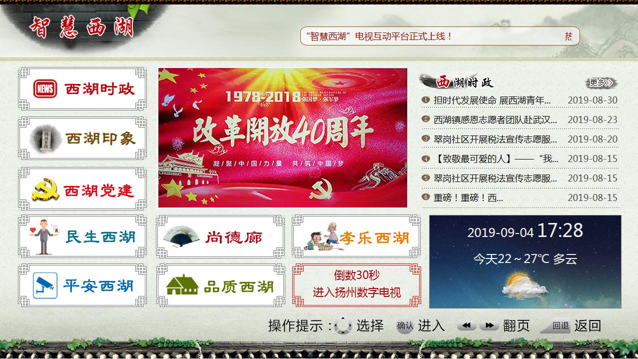 公司助力“智慧揚州”建設(shè),著力發(fā)展“智慧鄉(xiāng)鎮(zhèn)”,目前已形成以“智慧楊壽”、“智慧西湖”、“智慧沙頭”為代表的“智慧鄉(xiāng)鎮(zhèn)”電視互動平臺體系。以“智慧西湖”電視互動平臺為例,平臺通過整合西湖鎮(zhèn)各類信息資源,以圖文信息與視頻節(jié)目相結(jié)合的方法,將鎮(zhèn)政府工作動態(tài)、政策法規(guī)、各類活動信息推送到西湖鎮(zhèn)居民家中,最終實現(xiàn)信息資源的共享。項目主要有三大特點:一是高效實現(xiàn)基層信息傳遞“最后一公里”,西湖鎮(zhèn)居民打開互動機頂盒即出現(xiàn)“智慧西湖”界面,與傳統(tǒng)媒體相比,開機推送模式使平臺信息推送到達率更高;二是有效推進西湖鎮(zhèn)“群防群治”工作開展,“平安西湖”監(jiān)控平臺已在西湖鎮(zhèn)部分小區(qū)以及學(xué)校、廣場、公園等主要路段安裝實時監(jiān)控,西湖鎮(zhèn)居民在家即可觀看實時監(jiān)控畫面,還支持回放功能;三是有效推進全鎮(zhèn)現(xiàn)代公共文化服務(wù)體系建設(shè),加快高清村建設(shè)。該平臺對于完善西湖鎮(zhèn)公共服務(wù)體系,打通宣傳服務(wù)“最后一公里”,增強鎮(zhèn)黨委、政府宣傳力和影響力,具有重要的意義。