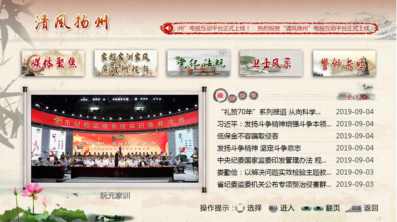 公司與市紀(jì)委緊密合作,共同開創(chuàng)了“清風(fēng)揚州”電視互動平臺,通過生動的圖文、視頻宣傳形式,為市委黨風(fēng)廉政建設(shè)提供了新的宣傳陣地。