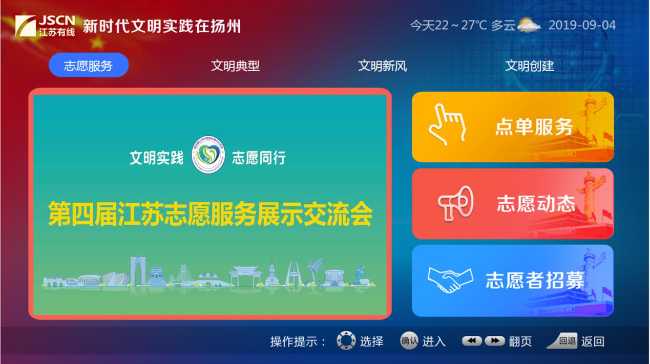 在揚州舉行的第四屆江蘇志愿服務(wù)展示交流會上,由揚州市委宣傳部(文明辦)與江蘇有線揚州分公司聯(lián)合打造的“新時代文明實踐在揚州”電視互動平臺亮相志交會揚州館。